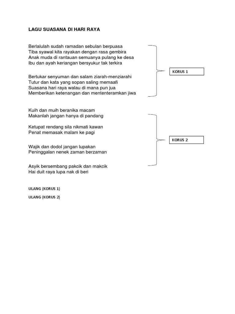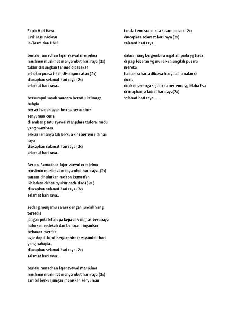 Hari ini kudendangkan Lagu yang ingin kunyanyikan Terkenang semua kenangan Yang tlah kualami. Bila Terdengar takbir bergema Hati Rasa riang gembira bersama semua Hari Raya bersama meraikannya Di Atas kemenangan kita setelah menahan Segala Ujian. Lagu Wajib Kebangsaan Indonesia Raya Lagu Hafalan Teori Musik Lirik Lagu Tihamah Nasyid Posts Facebook.